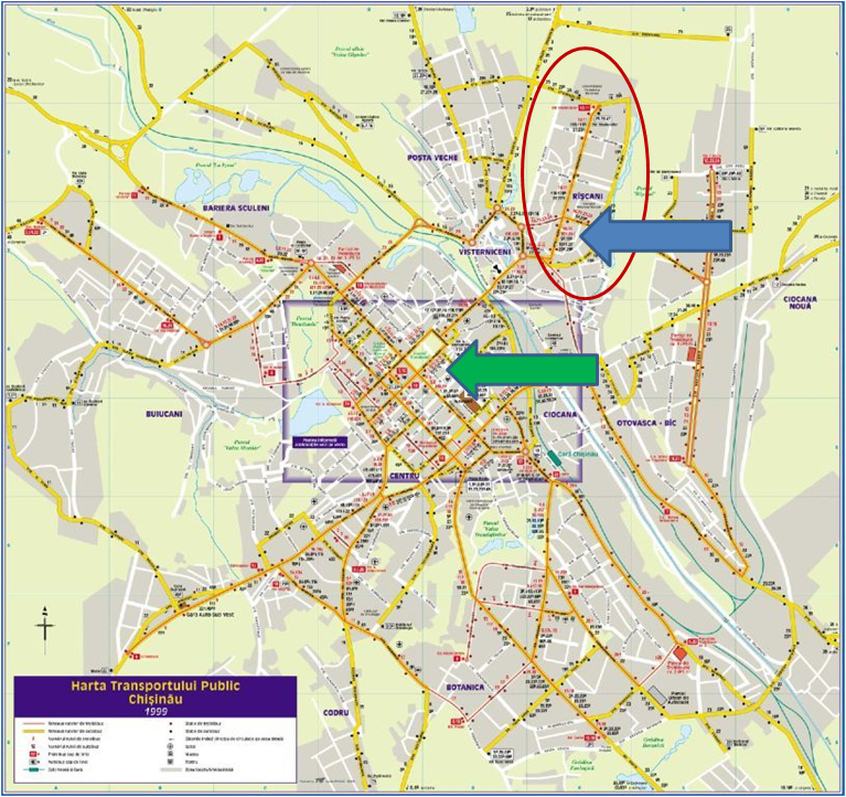 Bildītē labi redzama Kišiņevas “starveida” struktūra. Ar ovālu apvilku “savu” mikrorajonu, bulta rāda, apmēram kur dzīvoju. Centra bulta – augstskolas atrašanās vietu.