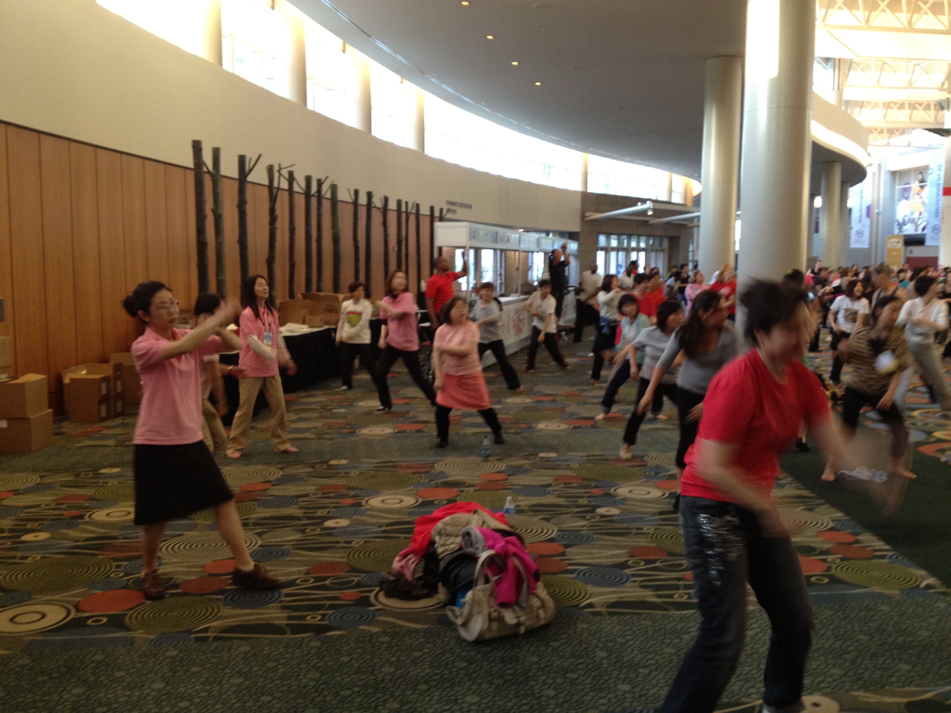 Pirmajam rītam visi sagatavojāmies gan praktiski, gan teorētiski pareizi – cēlāmies mazliet pēc 6iem, aizgājām mazās brokastīs (sula, mazliet persiku “kompota” – pirms slodzes cukurs nelielā devā ir pat vēlams) un uz vingrošanu projām. Bijām klāt 6.45, jo bija teikts, ka vietu skaits ir ierobežots un kurš agrāk atnāks, tas arī vingros. Cilvēku daudzums bija neaptverams, tērpi un vingrošanas spējas arī visdažādākās. Visas iespējamās rases, ticības (ar no tā izrietošajām ģērbšanās tradīcijām) un ķermeņu konstitūcijas, kā arī vecuma grupas juku jukām. Ja neskaitītu sīciņos aziātus, tad dominējošā svara kategorija bija ap 100 kg. Brīžiem pat man bija smieklīgi uz citiem paskatoties.